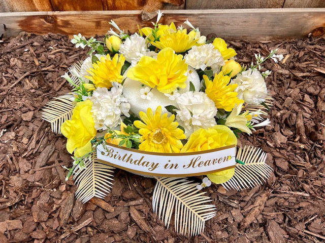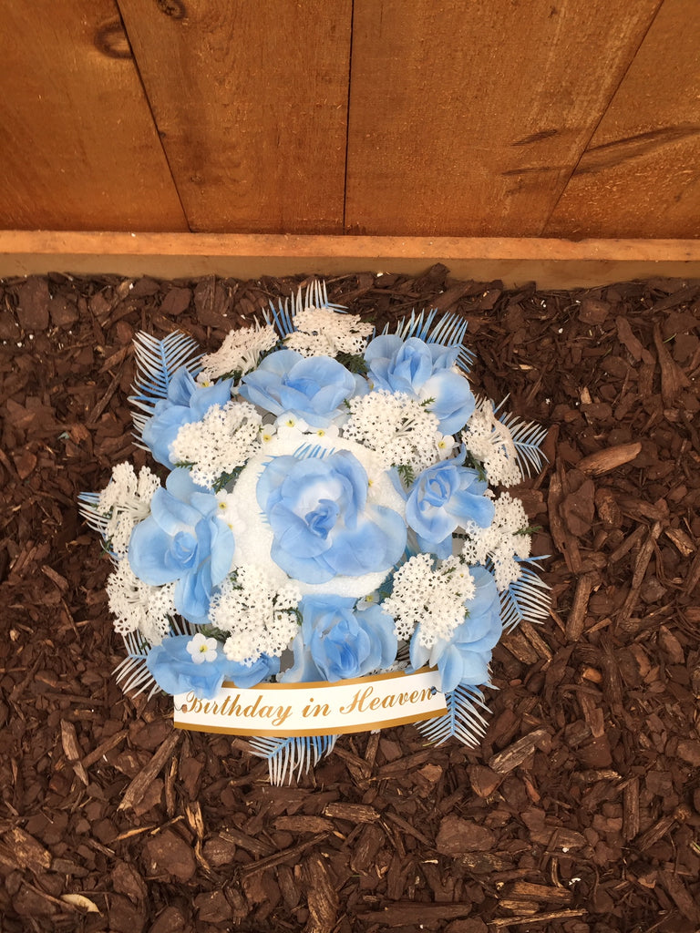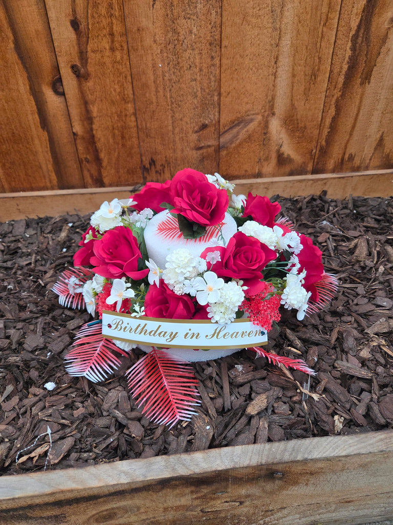 One of our signature pieces! This is a perfect arrangement to celebrate your loved one's birthday: A two tiered cake made of primarily silk carnations and roses.