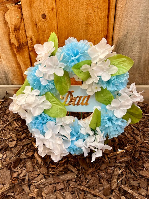 A special wreath to honor Dad! Made with silk carnations and greens and a silk "dad" banner in the middle.